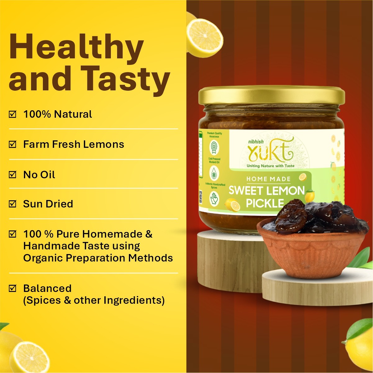 At Nibhish Enterprises (Yukt Foods), we bring you the timeless flavours of traditional Indian pickles and murabbas, handcrafted with love in small batches. Our recipes are rooted in family traditions, ensuring authentic taste, purity, and health benefits in every jar. We use only the finest quality ingredients, natural spices, and zero artificial preservatives to deliver true homemade goodness. From sweet murabbas to tangy pickles, our products add a burst of flavour to your meals. We believe in promoting healthier food choices by staying close to nature. Experience the rich taste of India’s culinary heritage with Yukt Foods.